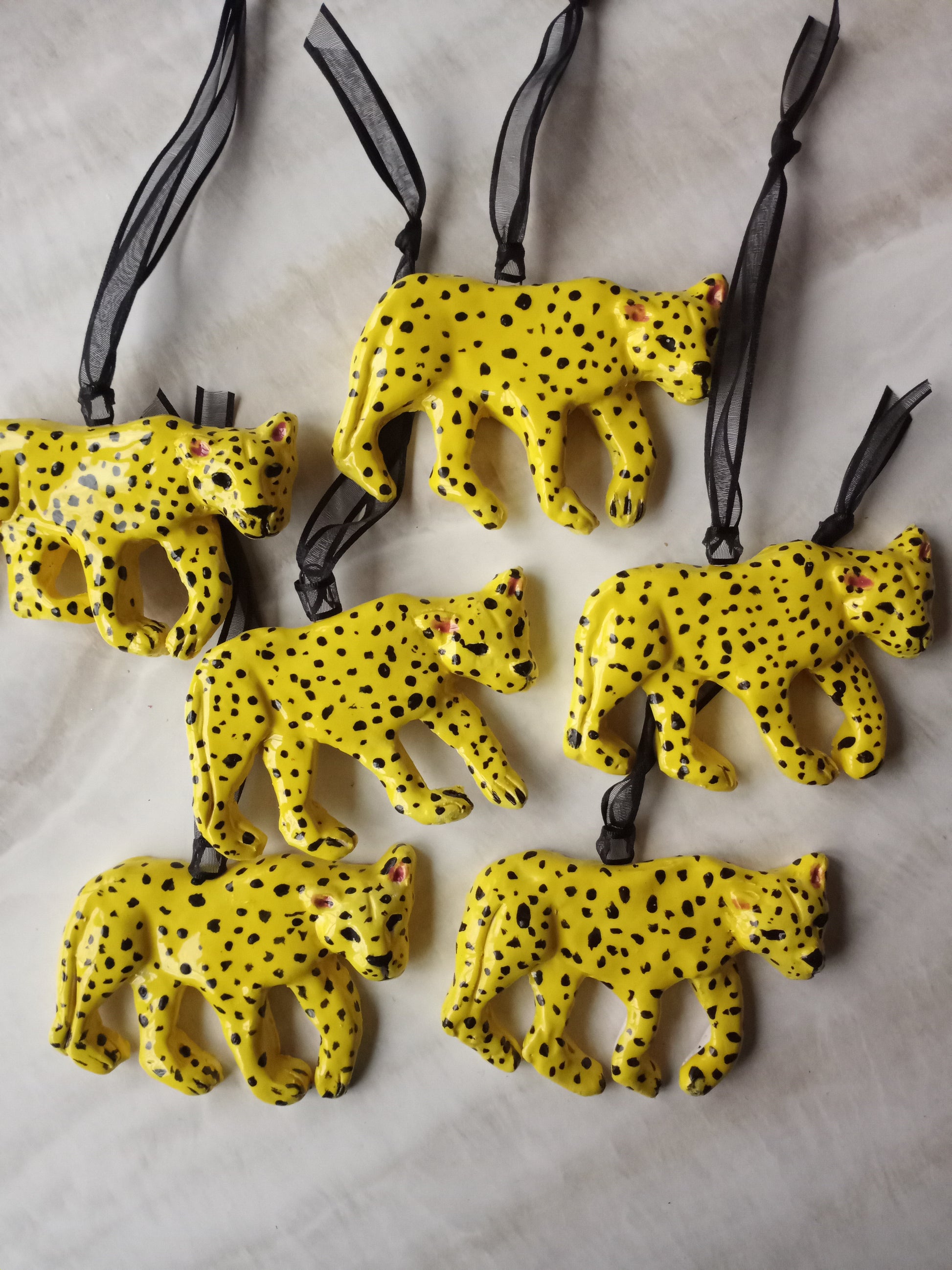 These ornaments are made of stoneware, glaze, and velvet ribbon. They add a chic design element to any decor. They are made with a plaster press mold and each animal charm is hand sculpted to give it individualized detail. They are hand painted. These leopard ornaments weigh approximately 2.5 Oz. and measure approximately 4 inches by 2.5 inches. They are beautiful enough to keep out all year long. They can easily be incorporated into room decor such as curtain tiebacks or hung from armoire knobs. They come in two color options, Ochre and Yellow. The velvet ties may vary from the colors in the images.