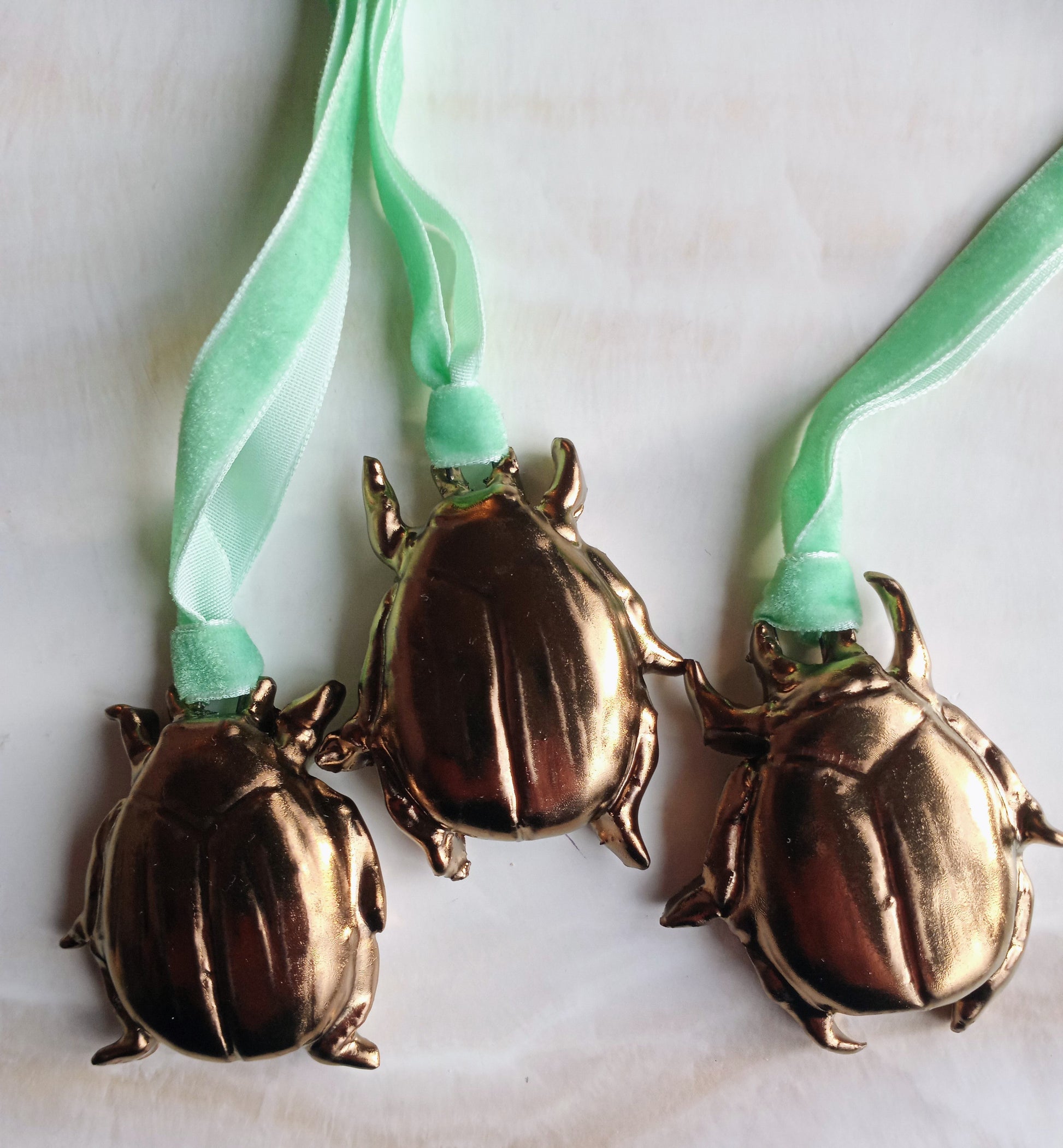 Goth Christmas? This is a unique Victorian era inspired scarab Christmas ornament. With hand sculpted detail, it is a true conversation peice. Each scarab is finished in a bronze glaze and is completely unique. This heirloom ornament will give your holidays a glamorous cabinet of curiosity aura! Velvet ribbon colors are at random. You may message me and I will try to accommodate requests for specific colors.