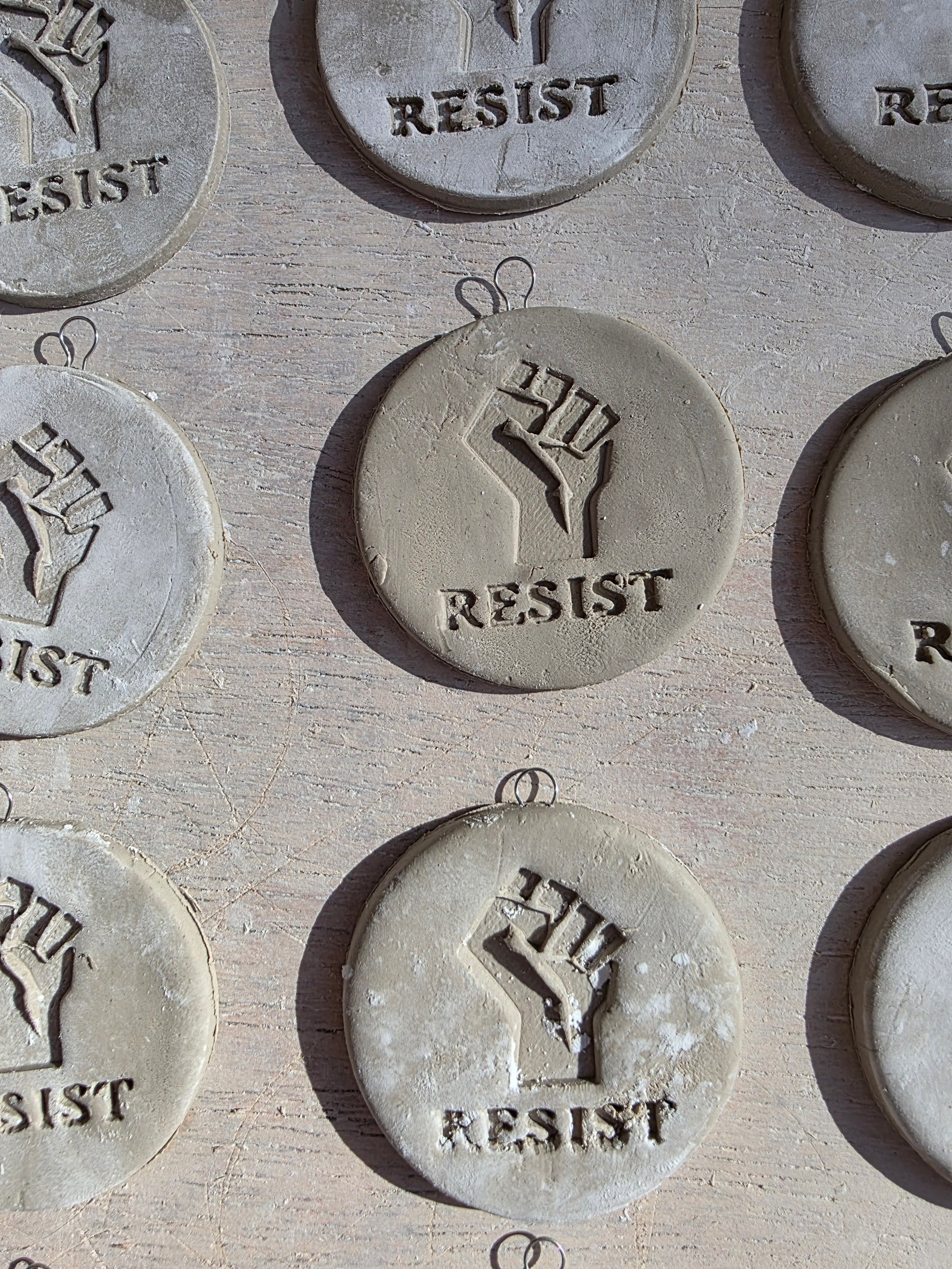 I create handmade ceramic “RESIST” medallions as small but powerful symbols of solidarity, courage, and collective action. Each piece is crafted with intention so that you can hold, display, and use as a reminder that we all have a role in shaping a more just and humane future.