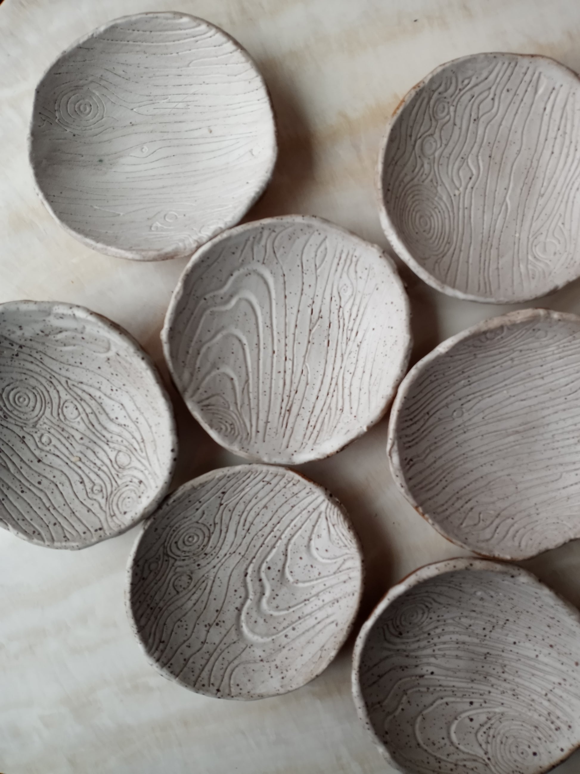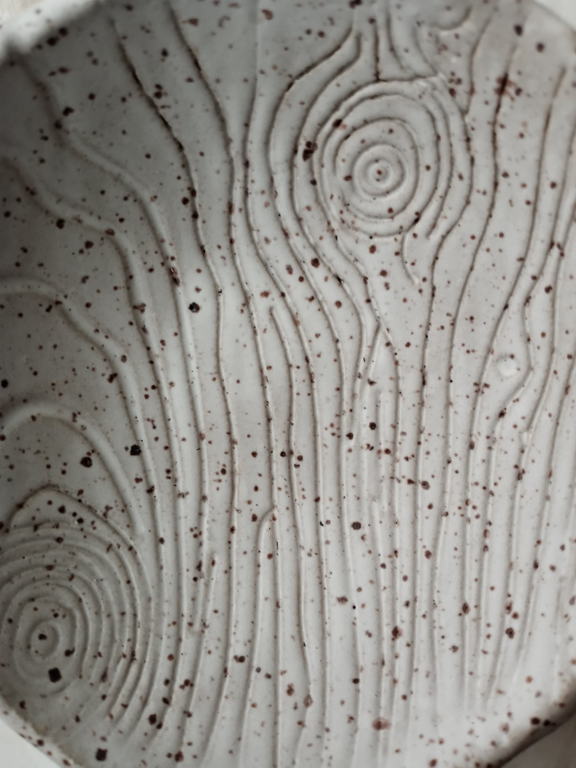 1 handmade faux bois textured ceramic smudge tray in matte white on speckled clay. The tray is food safe, dishwasher safe, do not microwave.
