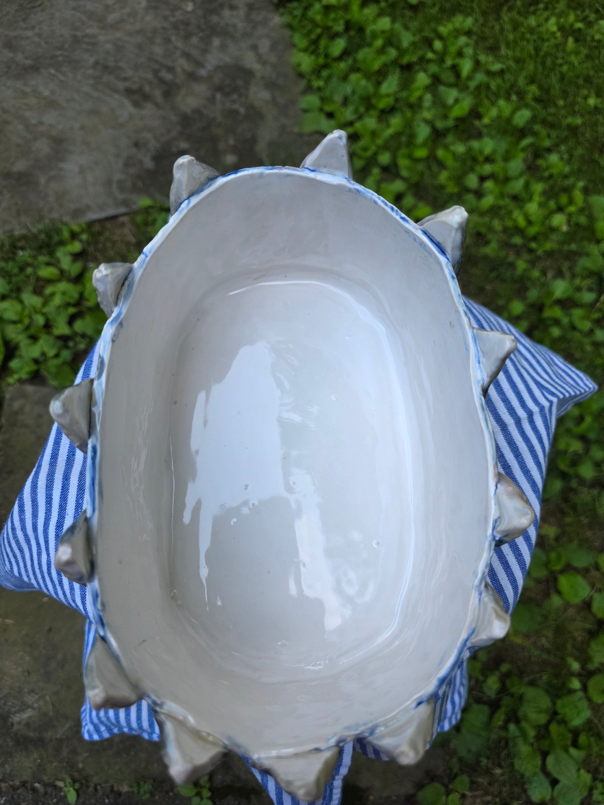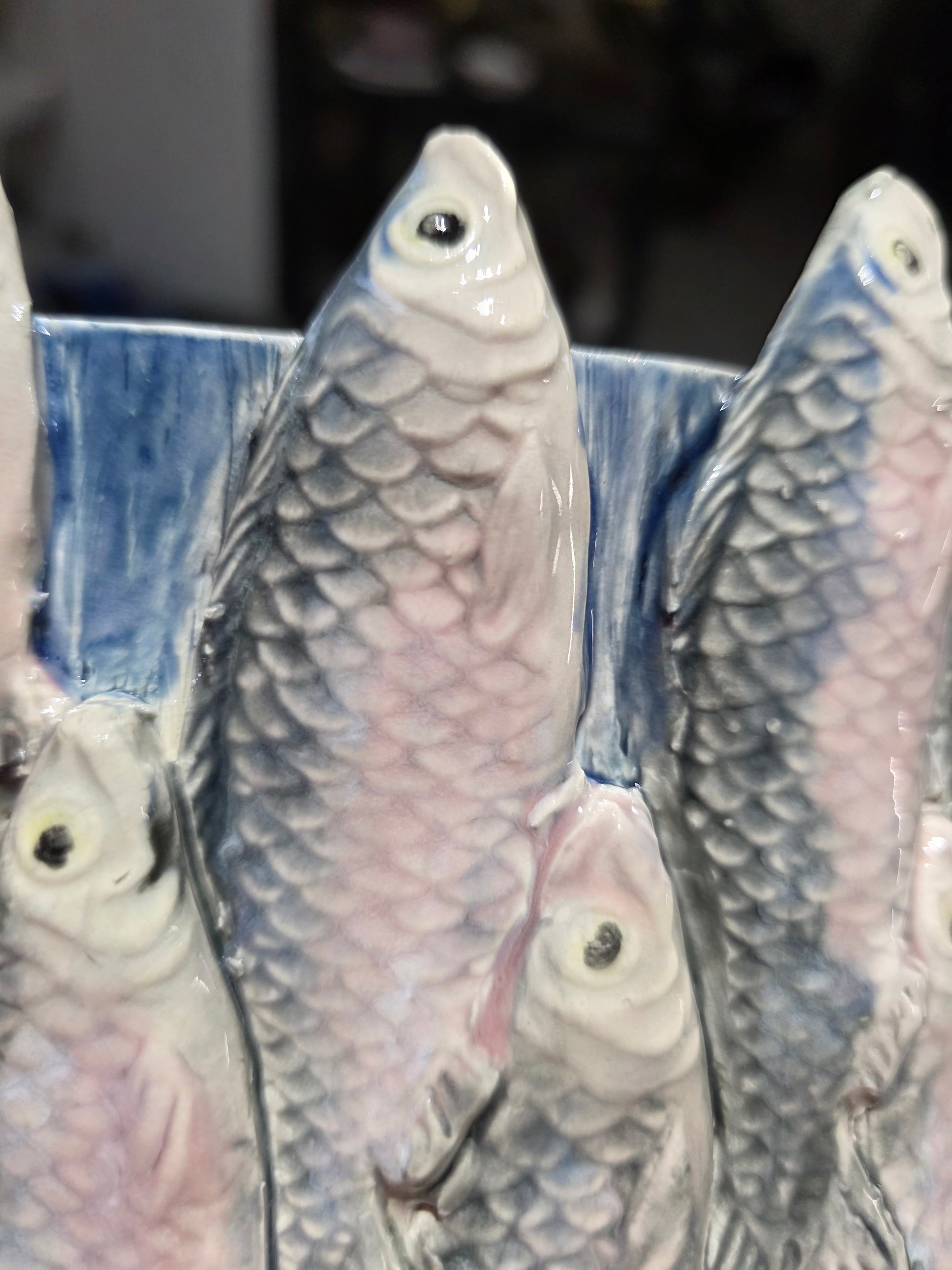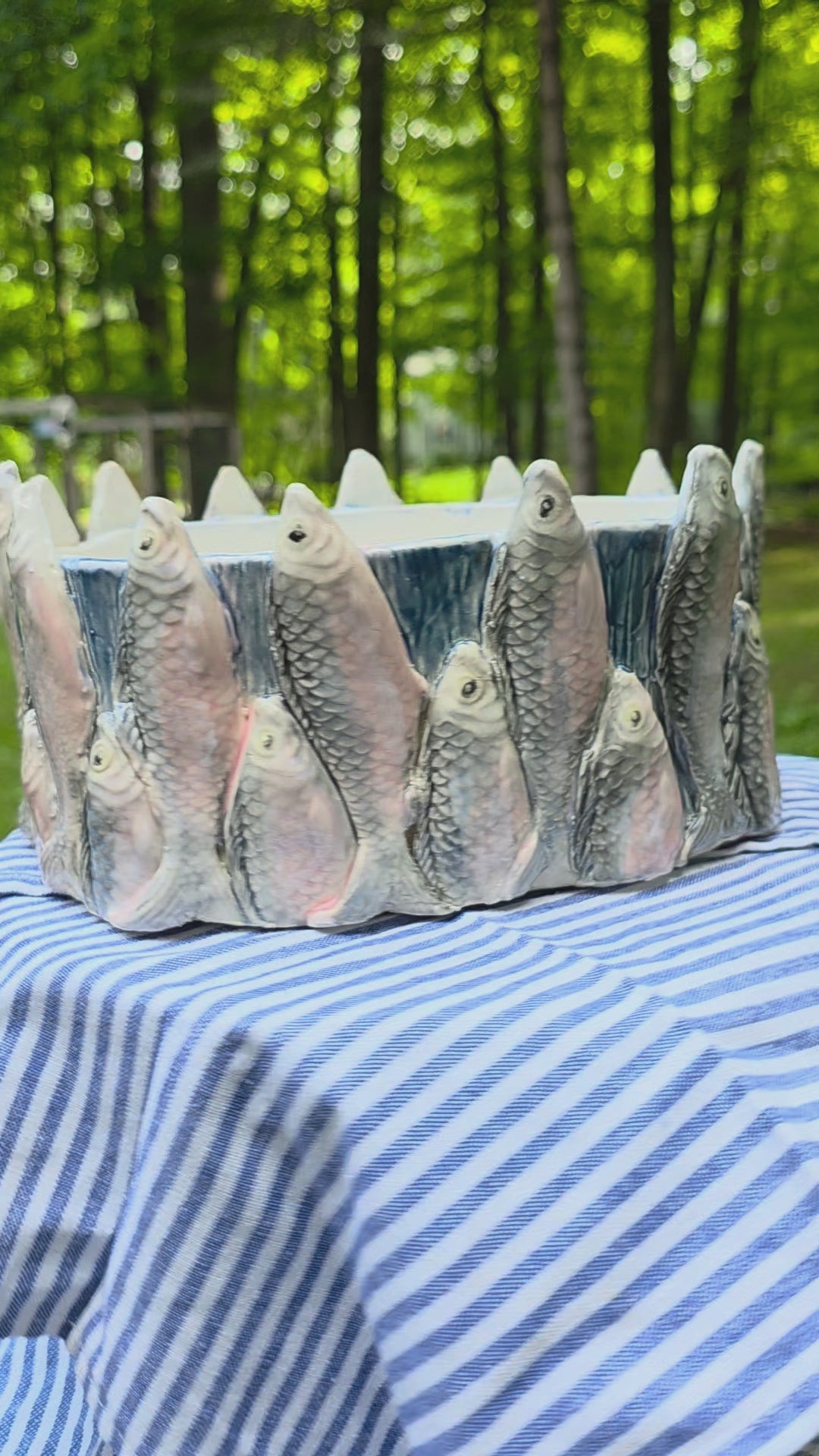 This statement piece is a functional stoneware vessel appropriate for food or flowers. Hand crafted in an oval arrangement. Each fish is hand painted and unique. The fish are arranged in an overlapping formation. The colors are gray, blues, and pink undertones.