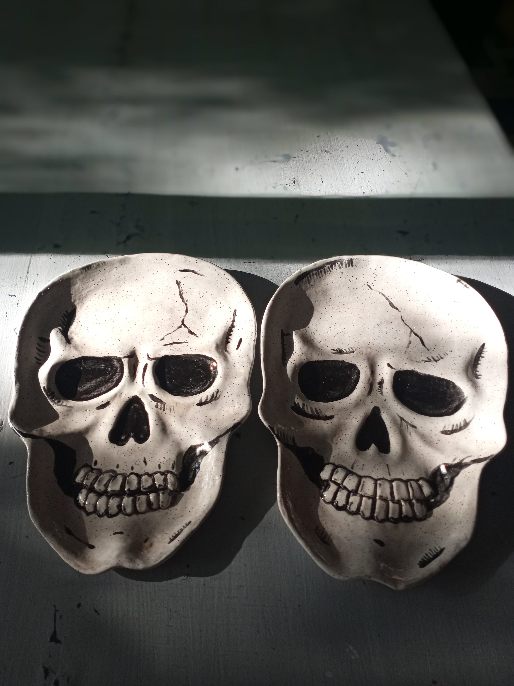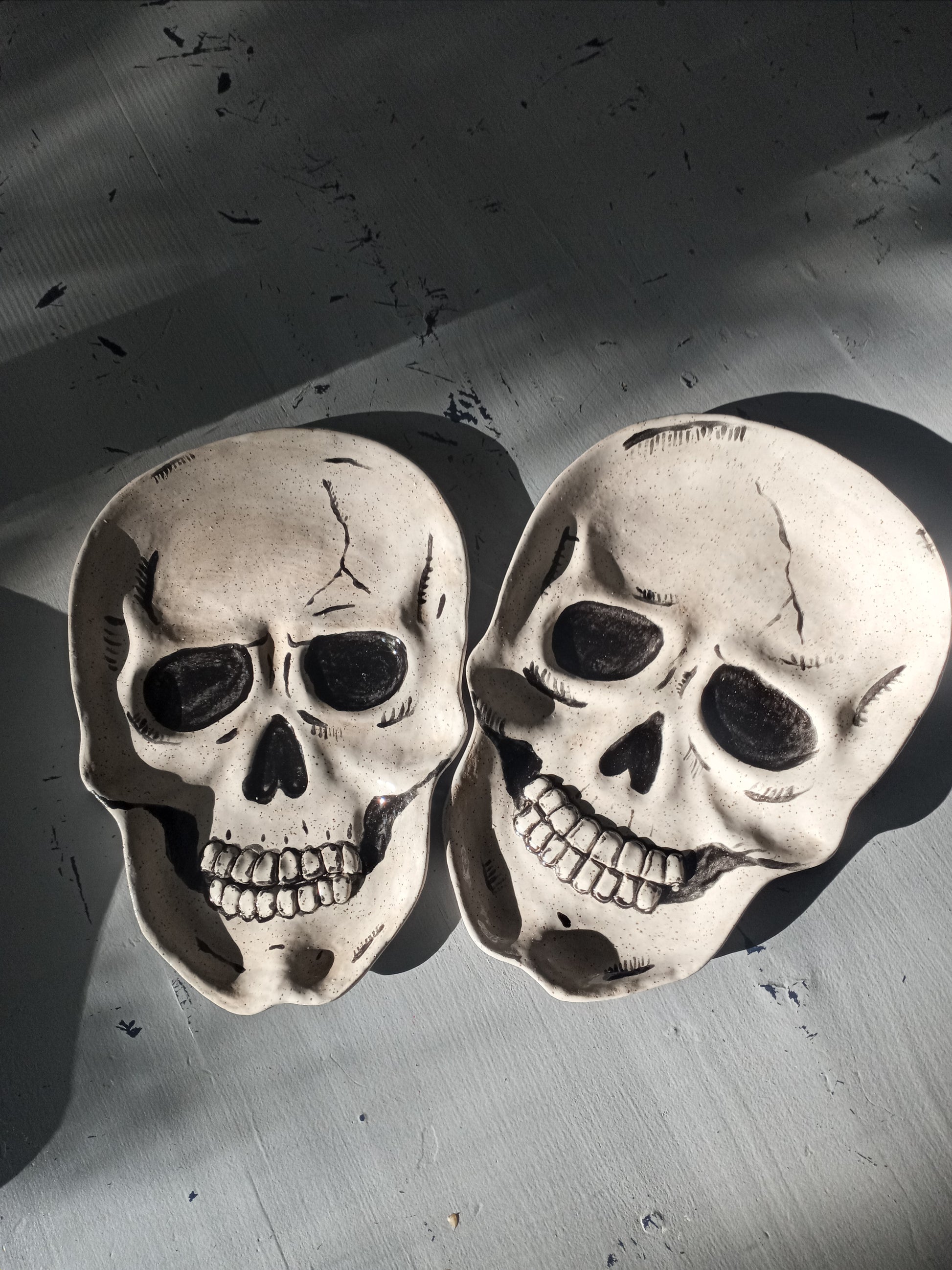 It is a spooky Halloween party platter or an everyday serving plate for the edgy individual! This speckled stoneware skull serve ware (Say it three times fast!) is the ultimate conversation starter. This skeletal peice is slab formed and hand painted. The dimensions vary, but are approximately 12" × 8" at its widest points. It is food and dishwasher safe. Do not microwave or place in oven.